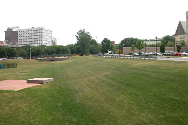 grassy swale covers the filled and culverted creek. Factory Street is at the