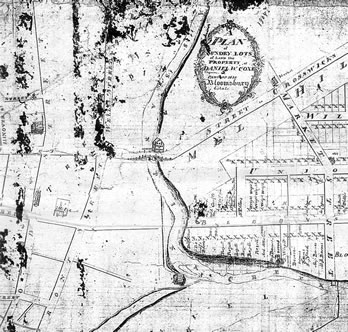 Trenton’s first venture into industrialized textile manufacture was hardly a spectacular success. In 1812, Josiah Fithian, a cabinet maker living on Second (today’s West State) Street, a few doors east of the New Jersey State House, set about establishing a cotton factory on Petty’s Run, a minor tributary of the Delaware River that flowed through his property. Borrowing heavily, Fithian erected a mill on the north side of the Front Street crossing of Petty’s Run on the site of an earlier water-powered plating mill and steel furnace (Figure 4). As the Trenton historian John Raum reported several decades later, Fithian “had completed the walls, put on the roof, and was about putting in the machinery for a cotton mill, when a heavy rain undermined the foundation, and the mill fell with a terrible crash – a mass of ruins. He rebuilt it, put in machinery and commenced the manufacture of cotton cloth. He continued here, however, but a short time, when he sold out to General Garret D. Wall, who converted it into a paper mill …”
