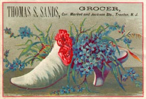 Thomas S. Sands This series of shoe trade cards promote a neighborhood grocer in a predominantly residential area illustrating the spread of this advertising form beyond the center city merchants.